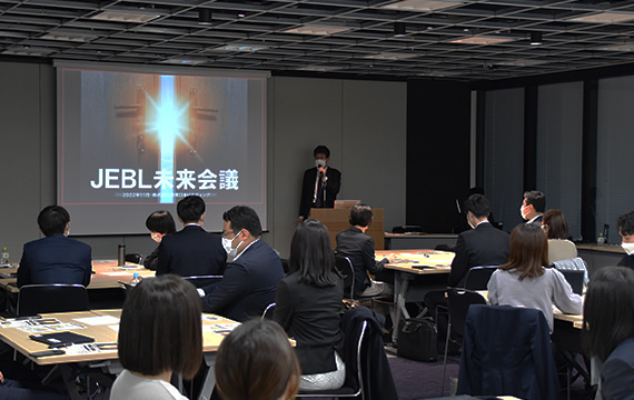 「JEBL未来会議」は、各年度中盤の秋頃に開催する⾏事で、当社が⾏動指針に掲げる”主体性”を具現 化するための取組みです。本会議では、会社のあるべき姿、その実現のために社員⼀⼈ひとりがと るべき⾏動等について、⾃由に本⾳で議論しています。
